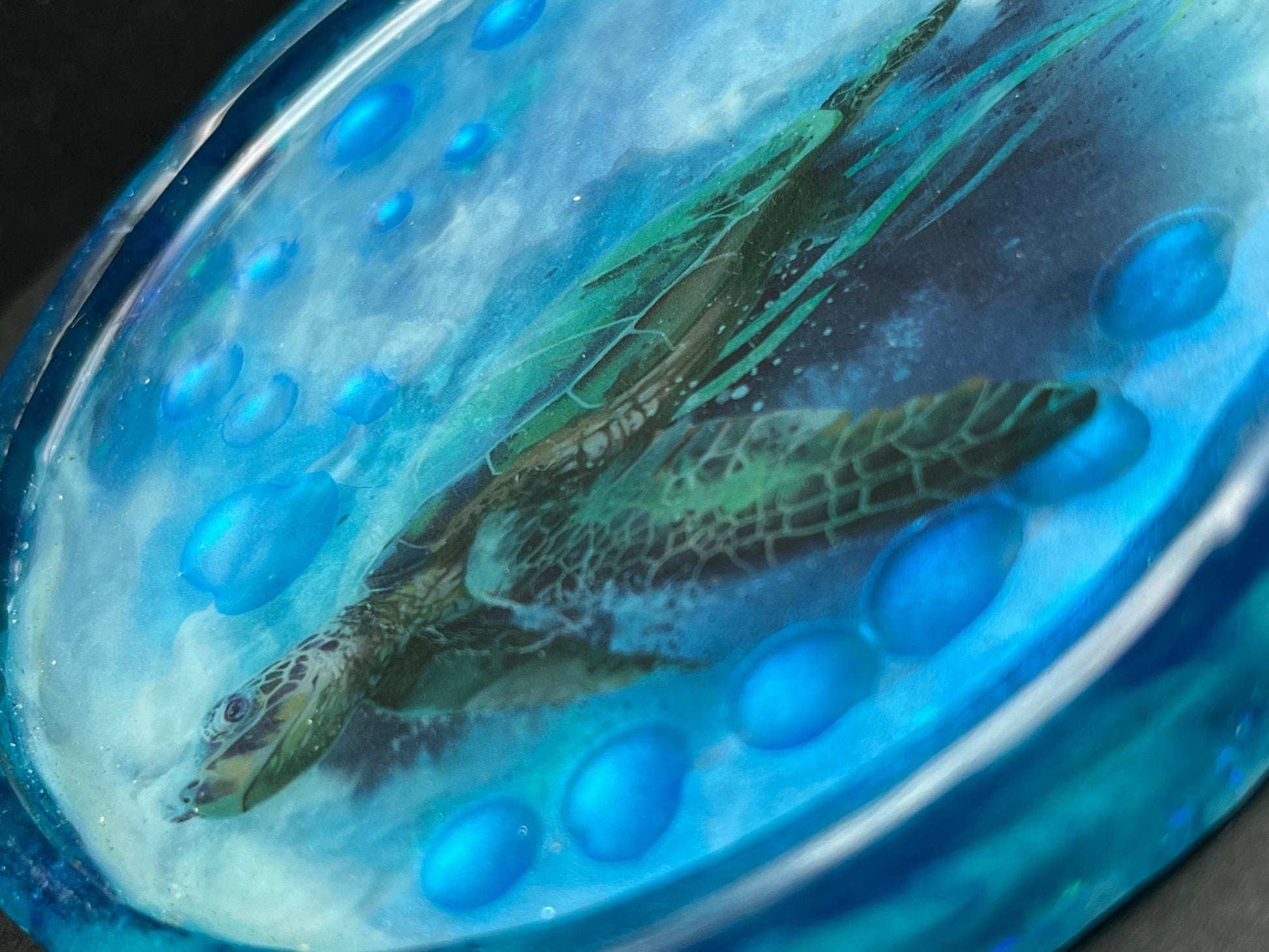One of a kind and the only one, coaster tray with a sea turtle with realistic oxygen bubbles swimming through the sea!